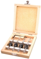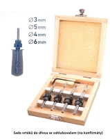 Sada vrtáků do dřeva s dorazem a zahlubovacím kroužkem. Vrtáky dodáváme ve čtyřech rozměrech. Jednotlivé vrtáky s dorazem jsou umístěny v praktické dřevěné krabičce.