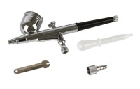 Dvojčinná stříkací pistole pro airbrush je nejenom jedním z nejoblíbenějších ve světě airbrush techniky, ale také nabízí širokou škálu využití v různých oborech. Svou jednoduchostí osloví zejména začátečníky, avšak nezůstane opomenuta ani profesionálními výtvarníky a modeláři. Se šroubovací tryskou o průměru 0,3 mm umožňuje tato airbrush pistole precizní kontrolu nad aplikací barvy. Horní šálek s objemem 7 ml poskytuje dostatek prostoru na barvu pro různé projekty. Nastavení množství podávané barvy je jednoduché díky šroubku umístěnému na konci pistole. Dvojčinná spoušť přináší optimální flexibilitu. Stlačením se uvolní vzduch a pohybem vzad se přidá barva, což umožňuje jemné a detailní provedení uměleckých děl. Pracovní tlak má v rozmezí 1 až 3 bar a váhu pouhých 0,350 kg. Tato lakovací pistole pro airbrush je skvělou volbou pro každého, kdo hledá spojení preciznosti a pohodlí při práci s barvami.