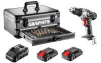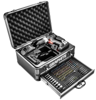 Dvourychlostní akumulátorový šroubovák 18V / 2Ah. Šroubovák dodáváme v hliníkovém kufru s bohatou výbavou 109 dílů. Součástí dodávky jsou dva akumulátory 18V / 2Ah a rychlonabíječka.