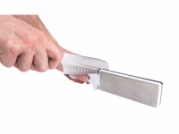 Diamantový brousek na nože a nůžky, který nabízí 5 funkcí v jednom kompaktním balení. Tento oboustranný brousek s diamantovým prachem o hrubostech P400/P1000 je dokonalým nástrojem pro udržení vašich nožů a nůžek v optimálním stavu. Plastovo - keramický vodič, který je součástí brousku, napomáhá lepšímu udržení konstantního sklonu čepele nože vůči brousku, což zajišťuje přesné a účinné broušení. V horní části rukojeti jsou zabudovány další dva sloty / komory, které umožňují hrubé i jemné broušení pomocí karbidových a keramických plátků. Vnitřní dvojitý slot / komora je určena pro ostření nůžek keramickými plátky, což zaručuje dokonalé ostření a dlouhou životnost vašich nástrojů. S tímto diamantovým brouskem budou vaše nože a nůžky vždy ostré a připravené k použití.