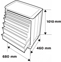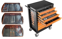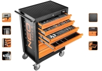 Dílenský vozík s nářadím. Vozík obsahuje 129 dílů nářadí, které je možné uložit do sedmi uzamykatelných zásuvek. Zásuvky jsou opatřeny lyžinami s ložisky pro snadné vysunutí. Každá zásuvka má svoji bezpečnostní západku proti samovolnému otevření při transportu. Díky velkým pětipalcovým otočným kolům se s tímto vozíkem výborně manévruje. Vozík můžete zatížit váhou až 280 kg.