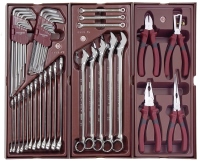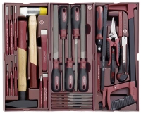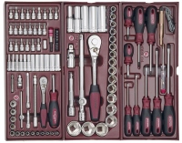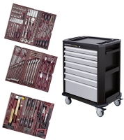 Dílenský vozík naplněný nářadím 191 Ks. Sestavy nářadí jsou uloženy ve 3 zásuvkách. Možnost doplnění sestavy o další moduly COMPLETO. Lehkou ovladatelnost a pohyblivost zásuvek zajišťuje uložení na kuličkových ložiscích. Zásuvky jsou vyjímatelné. Vozík je vybaven centrálním zamykáním a rychlozámky na každé zásuvce, které zajišťují ochranu proti nechtěnému otevření zásuvky při manipulaci s vozíkem.