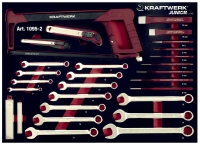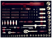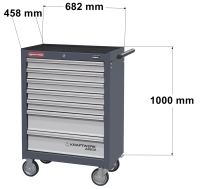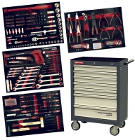 Dílenský vozík s nářadím 339 ks. Nářadí je uloženo v pěnových vložkách. 7 zásuvek vozíku s centrálním zamykáním. Díky uložení zásuvek na kuličkových ložiscích, jsou tyto zásuvky lehce pohyblivé. Zásuvky jsou plně vyjímatelné. Nosnost vozíku je 205 kg.