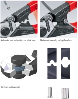 Kleště na kabely a drátěná lana s dvěma lisovacími profily pro koncovky krytek bowdenů a koncovky bowdenů.
