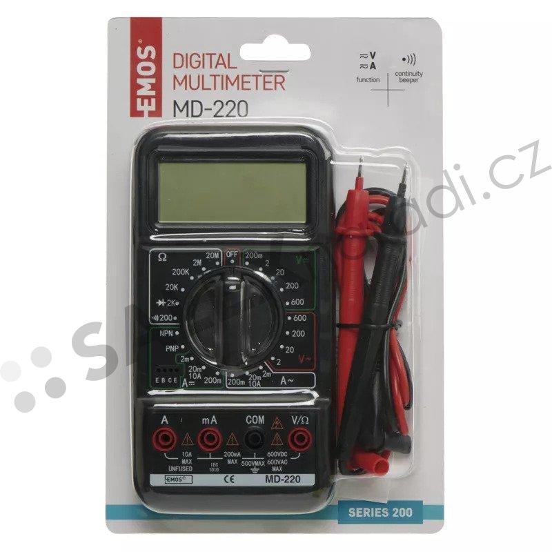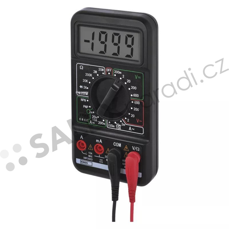 Digitální multimetr, který nabízí spolehlivé a přesné měření pro elektrické obvody i pro běžnou údržbu elektrických zařízení. Je vybaven manuální volbou rozsahu, která umožňuje uživatelům přizpůsobit měření podle konkrétních potřeb. Tento multimetr měří AC napětí v rozmezí 2–600 V, DC napětí od 200 mV do 600 V, AC proud od 2 mA do 10 A a DC proud od 2 mA do 10 A. Navíc může měřit elektrický odpor v rozmezí 200 Ohm – 20 MOhm. K dispozici jsou také funkce pro testování diod a tranzistorů a pro kontrolu spojitosti obvodů. Displej zajišťuje snadnou čitelnost a přesné zobrazení hodnot. Indikace slabé baterie vás včas upozorní na potřebu výměny baterie. Multimetr má rozměry 32 × 85 × 165 mm. Je napájen jednou 9V baterií, která je součástí balení. Kromě baterie, v balení najdete také návod k použití a měřicí hroty. Multimetr je dodáván v blistru.