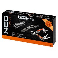 Multifunkční neo sada obsahuje nůž, svítilnu a multifunkční kleště. Čepel nože je vyrobena z oceli řady 400 o délce 7 cm, která je zabezpečena zámkem proti nechtěnému zavření nebo otevření. Tělo nože vyrobeno z Titanu. Svítilna je vybavena funkcí fokus určené k zaostření světla a krytím IPX7. Napájená 3x AAA baterií. Multifunkční kleště jsou vybaveny 9-ti nástroji. Multifunkční Neo sada lze využít při kempování, rybolovu, práci v dílně nebo na zahradě atd..