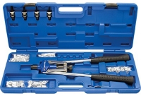 Profesionální pákové kleště pro instalaci slepých maticových nýtů o rozměrech M3 - M10. Kleště jsou dodávány v praktické příruční sadě. Sada obsahuje příslušenství a hliníkové maticové nýty po 20 kusech. Páky kleští jsou vyrobeny z kvalitní oceli a mají ergonomické protiskluzové rukojeti. Sada obsahuje závitové trny a hubice M4, M5, M6, M8 a M10