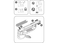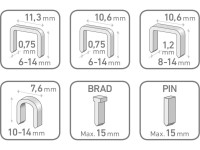 Sponkovací pistole je navržena pro použití s 6 různými typy spon a 2 typy hřebíků (10,6x1,2mm, 10,6x0,75mm, 11,3x0,75mm, kabelové spony 7,6mm, 2typy hřebíků: s hlavičkou a bez hlavičky). Sponkovačka nabízí širokou škálu možností pro různé projekty. Díky možnosti nastavení síly úderu ve dvou krocích (větší/střední) poskytuje sponkovačka plnou kontrolu nad každým spojem. Kovový hák k zavěšení na opasek zvyšuje pohodlí při práci a udržuje nástroj v dosahu. Navíc, extra silný úderový mechanismus umožňuje spolehlivé používání i při aplikaci nejdelších spon do tvrdého dřeva.