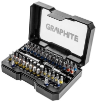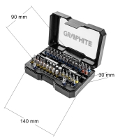 Barevně značená všestranná sada bitů GRAPHITE. 60 - ti dílnou sadu dodáváme v plastovém pouzdru. Součástí sady jsou dva unašeče bitů do aku vrtačky. Jeden s mechanickou pojistkou a jeden magnetický. Nejčastěji používané velikosti PH2 a PZ2 jsou v sadě obsaženy vícekrát.