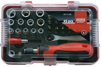 Sada bitů a nástavců s ráčnou a šroubovákem.Sada 45 dílů dodávána v plastovém pouzdře. Přesný mechanismus mini ráčny s možností měnit směr práce (vpravo nebo vlevo), vám dává možnost pracovat i ve stísněných podmínkách.