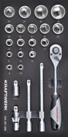 Sada nářadí uložena do pěnové vložky. Sada je určena pro dílenské vozíky Kraftwerk BASIC LINE. Tato kvalitní 23 dílná 1/2" gola souprava "S" Basic Line obsahuje vše, co potřebujete pro efektivní práci. Součástí sady jsou šestihranné nástavce v rozměrech 8 - 10 - 11 - 12 - 13 - 14 - 15 - 16 - 17 - 18 - 19 - 21 - 22 - 23 - 24 - 27 - 30 - 32 mm, které umožňují práci s širokou škálou různých šroubů a matic. Souprava zahrnuje také 1/2" ráčnu, která zaručuje rychlé a pohodlné utahování a povolování. Dále v sadě naleznete prodlužovací nástavce o délce 150 a 250 mm, které vám umožní dosáhnout i na těžko přístupná místa. Pro maximální flexibilitu práce je součástí sady kardanový kloub, který umožňuje práci pod úhlem. Redukční adaptér 3/8 - 1/2" pak zajišťuje kompatibilitu s dalšími nástroji a příslušenstvím. Nářadí je přesně a prakticky uloženo ve speciální EVA vložce, která zajišťuje jeho bezpečné a přehledné uspořádání. Tato sada je ideální volbou pro profesionály, kteří hledají spolehlivost a kvalitu ve své práci.