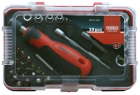 Sada bitů a nástavců v plastovém pouzdře. Sada 39 dílů. Bity jsou vyrobeny z odolné oceli, která zaručuje dlouhou životnost nástrojů. Ergonomicky tvarovaná rukojeť šroubováku je pokrytá protiskluzovým materiálem pro zajištění maximálního přenosu kroutícího momentu a zajištění komfortu při práci.