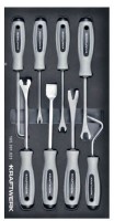 8 dílná sada hrotů a uvolňovačů polstrování určena pro uložení do dílenských vozíků BASIC LINE. Tato profesionální 8 dílná sada je navržena pro montáž a demontáž obložení interiéru vozidel. Obsahuje širokou škálu nástrojů, včetně odstraňovače čalounění o rozměrech 100 mm, 110 mm a 132 mm, odstraňovače závlačky, škrabky nebo odstraňovače klipů velikosti 5/16" (115 mm) a 1/4" (115 mm). Všechny nástroje jsou uloženy ve speciální EVA vložce, která zajišťuje jejich bezpečné a přehledné uložení. Perfektní volba pro každého, kdo se věnuje opravám a údržbě interiérů vozidel, ať už profesionálně nebo jako koníček.