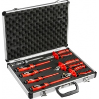 Praktická sada elektrikářských kleští a šroubováků do 1000V v hliníkovém kufru. Nezbytnou součástí sady je i zkoušečka napětí do 230 V. Šroubováky jsou vyrobené z vysoce odolné chrom-molybdenové oceli. Čelisti kleští jsou kované z chrom-vanadiové oceli. Ergonomicky tvarované držadla šroubováků a kleští pro pohodlné uchopení a optimální přenos síly.