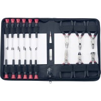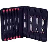 19-ti dílný soubor nářadí, ideální nejen pro elektrikáře. Tato sada obsahuje širokou škálu kleští a šroubováků, které vyhovují různým účelům a potřebám. K sadě je přiložena také nerezová pinzeta, která poskytuje precizní manipulaci a je odolná vůči korozi. Všechno nářadí je uloženo v černé tašce s zipem, která chrání nářadí před poškozením a zajišťuje jeho dlouhou životnost. Taška je kompaktní a snadno přenosná s rozměry 240 x 190 x 35 mm (š x v x h).