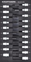 Sada nástavců uložena do pěnové vložky. Sada je určena pro dílenské vozíky Kraftwerk BASIC LINE. Tato 21 dílná sada bitových nástavců je ideální volbou pro náročné úkoly a profesionální použití. Sada obsahuje Inbus bitové nástavce: 6, 7, 8, 9, 10, 12, 14, 17 mm (Inbus H6-H17, RM8-14, M5-M16), Veeltand bitové nástavce: M5, M6, M8, M10, M12, M14, M16, Ribe bitové nástavce: M8, M9, M10, M12, M14. Tato sada nabízí široký rozsah bitových nástavců pro různé použití. Díky preciznímu a praktickému uspořádání v speciální EVA vložce je sada nejen funkční, ale i snadno přístupná a organizovaná. Perfektní pro každého profesionála, který hledá spolehlivé a kvalitní nářadí pro svou práci.