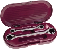 Sada oboustranných ráčnových klíčů s přepínací páčkou.