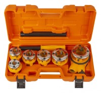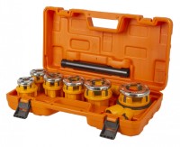 Sada ráčnových závitníků na trubky. Závitníky jsou vyrobeny z vysoce kvalitní tvrzené oceli 9CRSI. Rozměry jsou 200 x 400 x 100 mm. Sada je uložena v plastovém kufříku. Váží 6,325 kg.