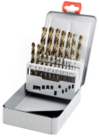 19-dílná sada spirálovitých vrtáku do kovu HSS-Co v kovové krabičce.