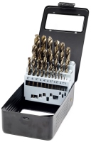 25-dílná sada spirálovitých vrtáku do kovu HSS-Co v kovové krabičce.