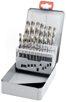 19-dílná sada spirálovitých vrtáku do kovu HSS-G v kovové krabičce.
