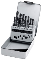 19-dílná sada spirálovitých vrtáku do kovu HSS-R v kovové krabičce.
