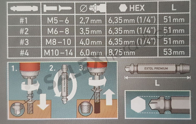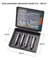 Sada vytahováků zalomených šroubů. Čtyři kusy vytahováků pro šrouby M5 až M14. Unikátní tvar vytahováků dva v jednom. Tato sada najde své uplatnění v autoservisech, dílnách, údržbě ale i ve výrobě nebo v domácí dílně. Vytahovák je nezbytným pomocníkem, když potřebujete vyšroubovat šroub který není možno ničím uchopit pro jeho vyšroubování.