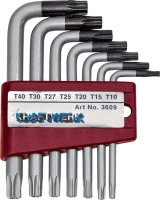 Sada zahnutých klíčů TORX s otvorem v plastovém klipu. Krátká forma.