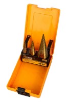 Stupňovité vrtáky v sadě. 3 kusy stupňovirých vrtáků v plastovém boxu. Stupňovitý vrták využijete pro vrtání běžných typů průmyslových plastů a kovu stejně tak ocelových desek do 3 mm tloušťky.