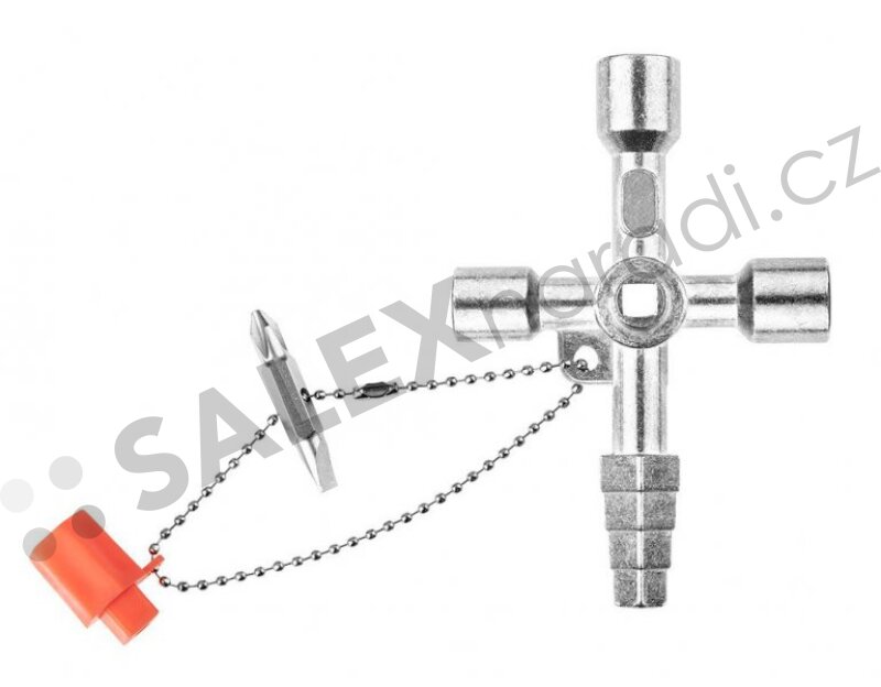 Tento univerzální klíč je praktický a spolehlivý nástroj pro otevírání a zavírání široké škály rozvodných skříní a technických systémů. Je ideální pro profesionály pracující v elektroinstalacích, plynových, topenářských, sanitárních systémech i výtazích. Díky své univerzálnosti je skvělou volbou pro servisní a instalační techniky. Hlavní výhodou je všestranné využití v různých technických oborech. Univerzální klíč má vnější čtyřhranný klíč (6.2 / 7.2 / 8.2 / 9.3 mm), vnitřní čtvercový klíč (7.2 mm a 8.2 mm), vnitřní trojhranný klíč (10 mm), středový čtyřhran (5 mm), oboustranný bit s plochým a křížovým PH2 zakončením a také praktický 1/4" adaptér pro bity. Klíč je nepostradatelný pomocník všude tam, kde se pracuje s technickými rozvaděči.