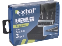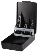 Sada stupňovitých vrtáků HSS se spirálovou drážkou, pro vrtání kruhových otvoru v slitinových i neslitinových ocelových plátech, v profilech a trubkách do tloušťky materiálu 4mm. Stupňovité vrtáky lze použít také pro vrtání do měkčích materiálů. Například plasty dřevo nebo plexisklo.