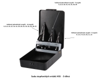 Sada stupňovitých vrtáků HSS v plastové krabičce. Spirálová drážka.